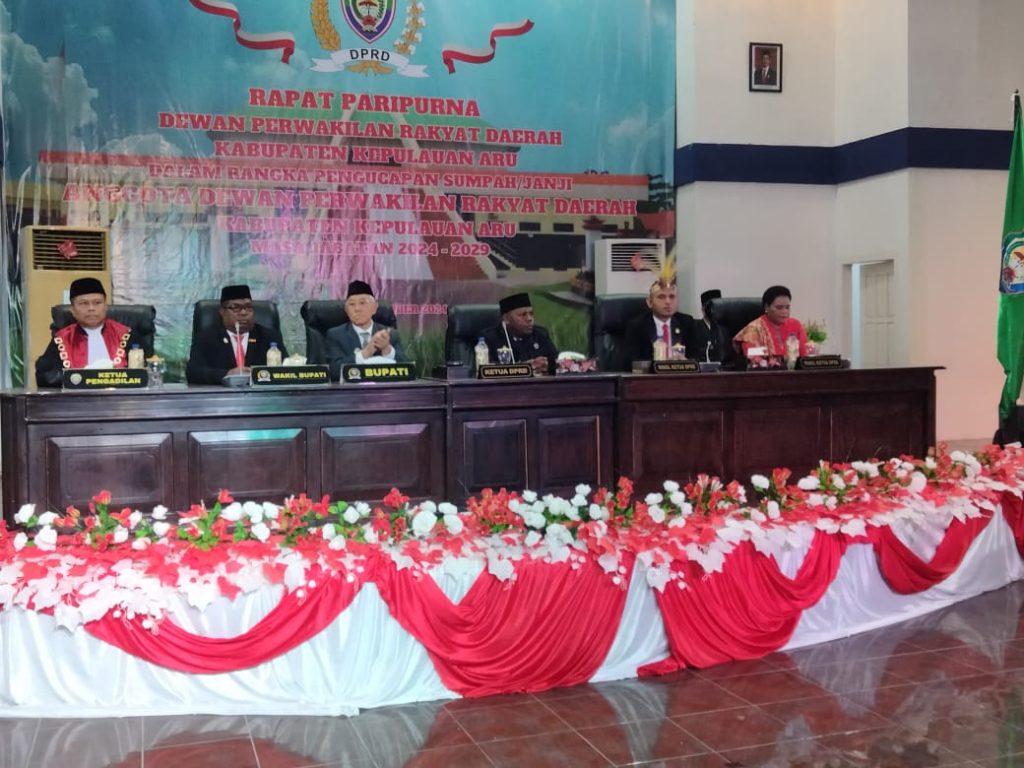 Dobo-Diskominfo. Bupati Kabupaten Kepulauan Aru menghadiri rapat paripurna Dewan Perwakilan Rakyat Daerah (DPRD) dalam rangka pengucapan sumpah dan janji Pimpinan DPRD periode 2024-2029 di ruang sidang sementara gedung sita kena dobo Kamis (21//11/2024). Rapat tersebut di pimpin oleh ketua sementara DPRD Kabupaten Kepulauan Aru Fenny Silvana Loy dari Partai Demokrasi Indonesia Perjuangan (PDIP), dan Wakil Sementara Udin […]